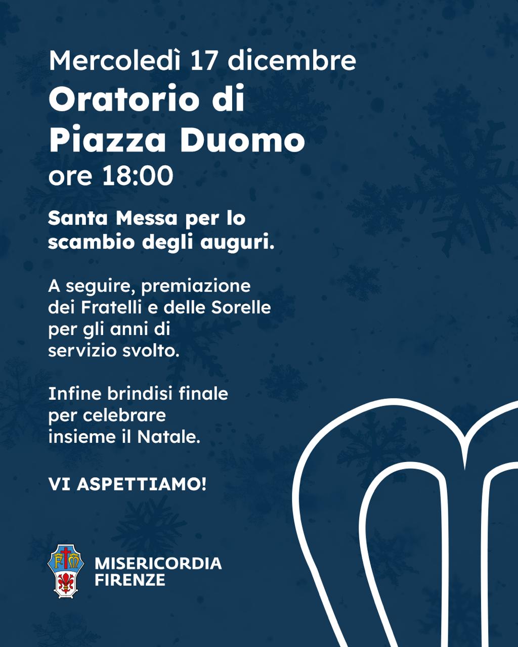Mercoledì 17 dicembre, nell'Oratorio in piazza Duomo, avrà luogo la S. Messa per il consueto scambio degli auguri per i volontari e i dipendenti della Misericordia e delle sue Imprese Sociali.