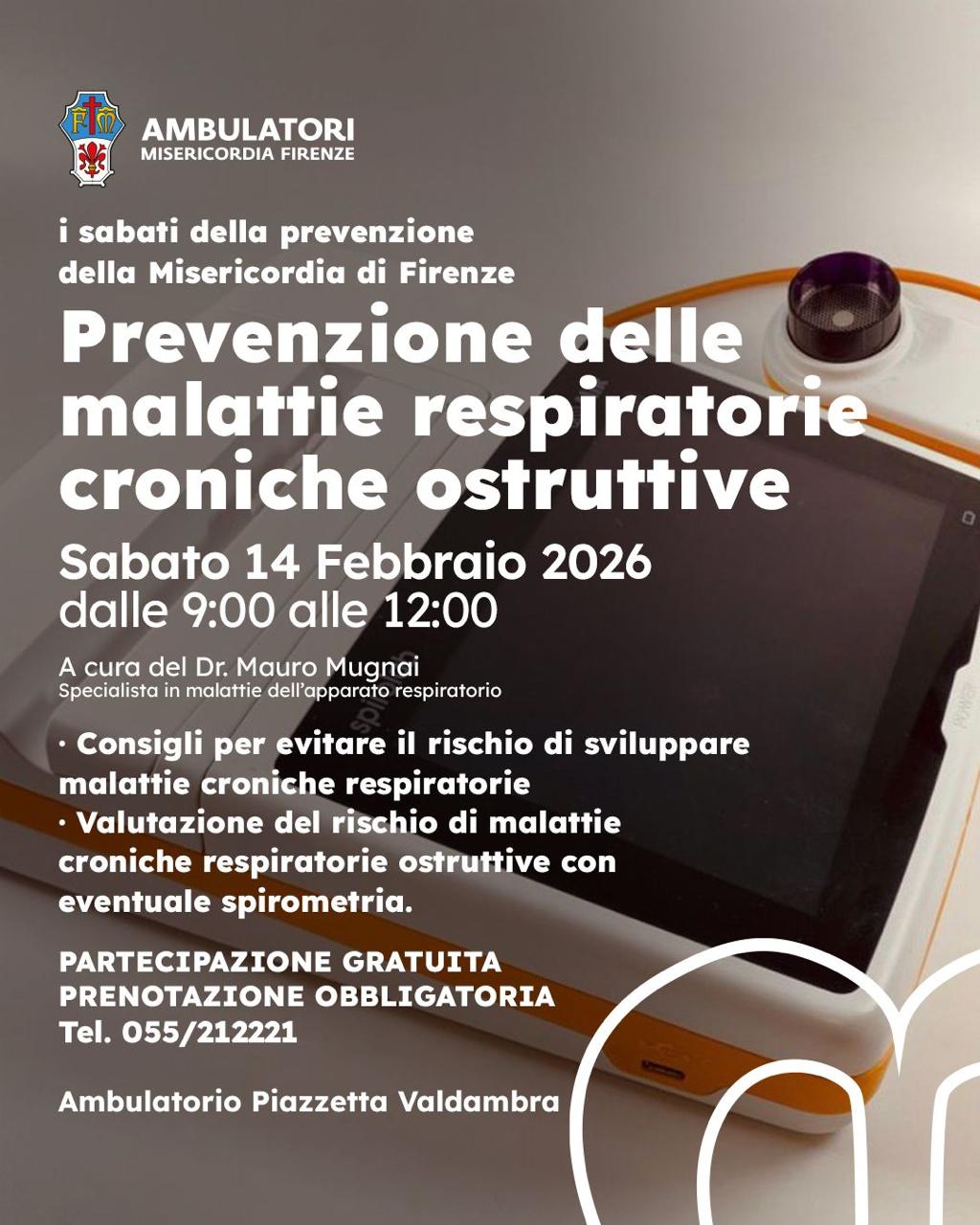 Sabato 14 febbraio 2026, dalle 09:00 alle 12:00 - nel presidio di Novoli in piazzetta Valdambra, 8 - a cura dello specialista in malattie dell’apparato respiratorio Dott. Mauro Mugnai