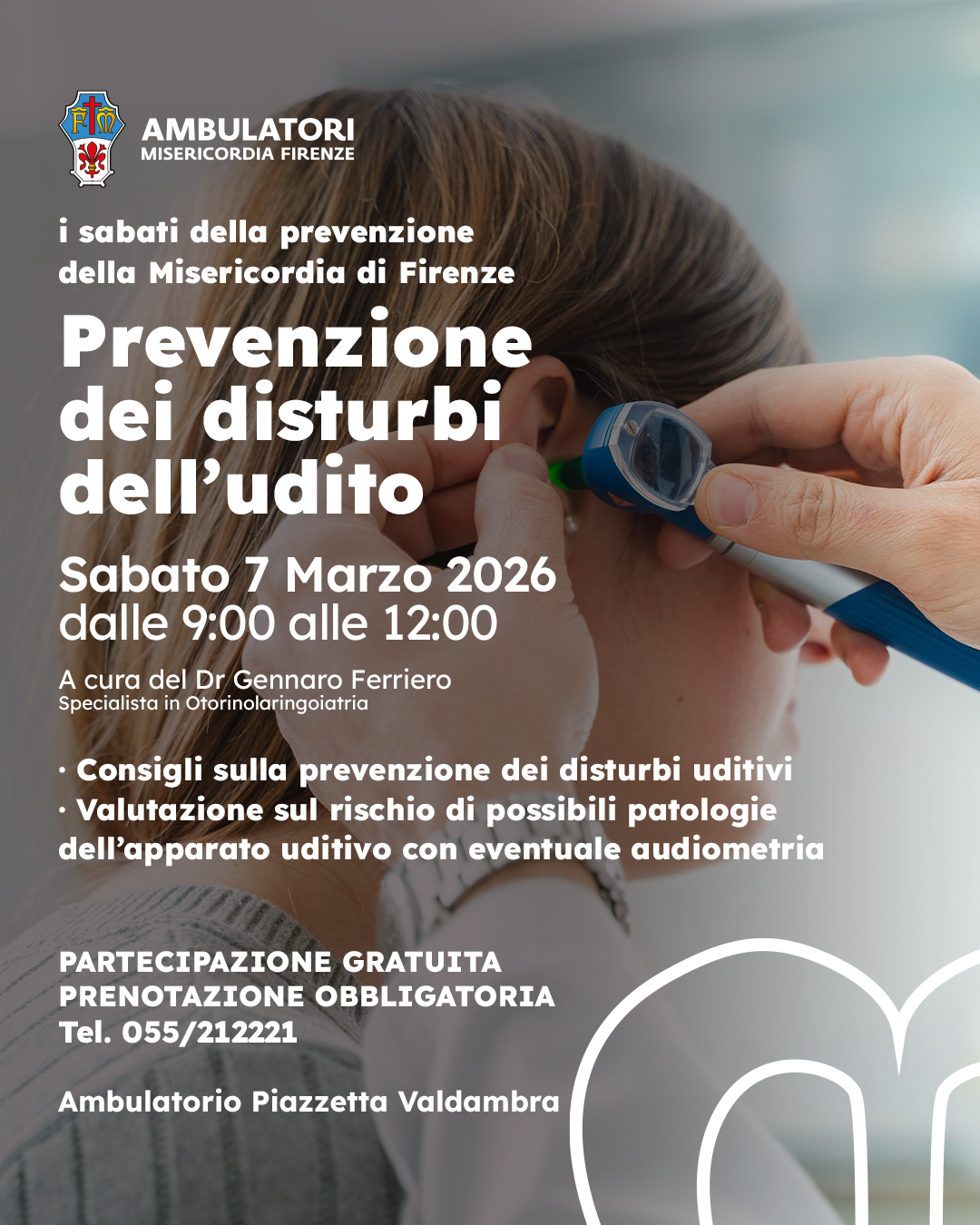 Dalle 09:00 alle 12:00 nel presidio di Novoli in piazzetta Valdambra, 8, a cura dello specialista in otorinolaringoiatria Dott. Gennaro Ferriero: